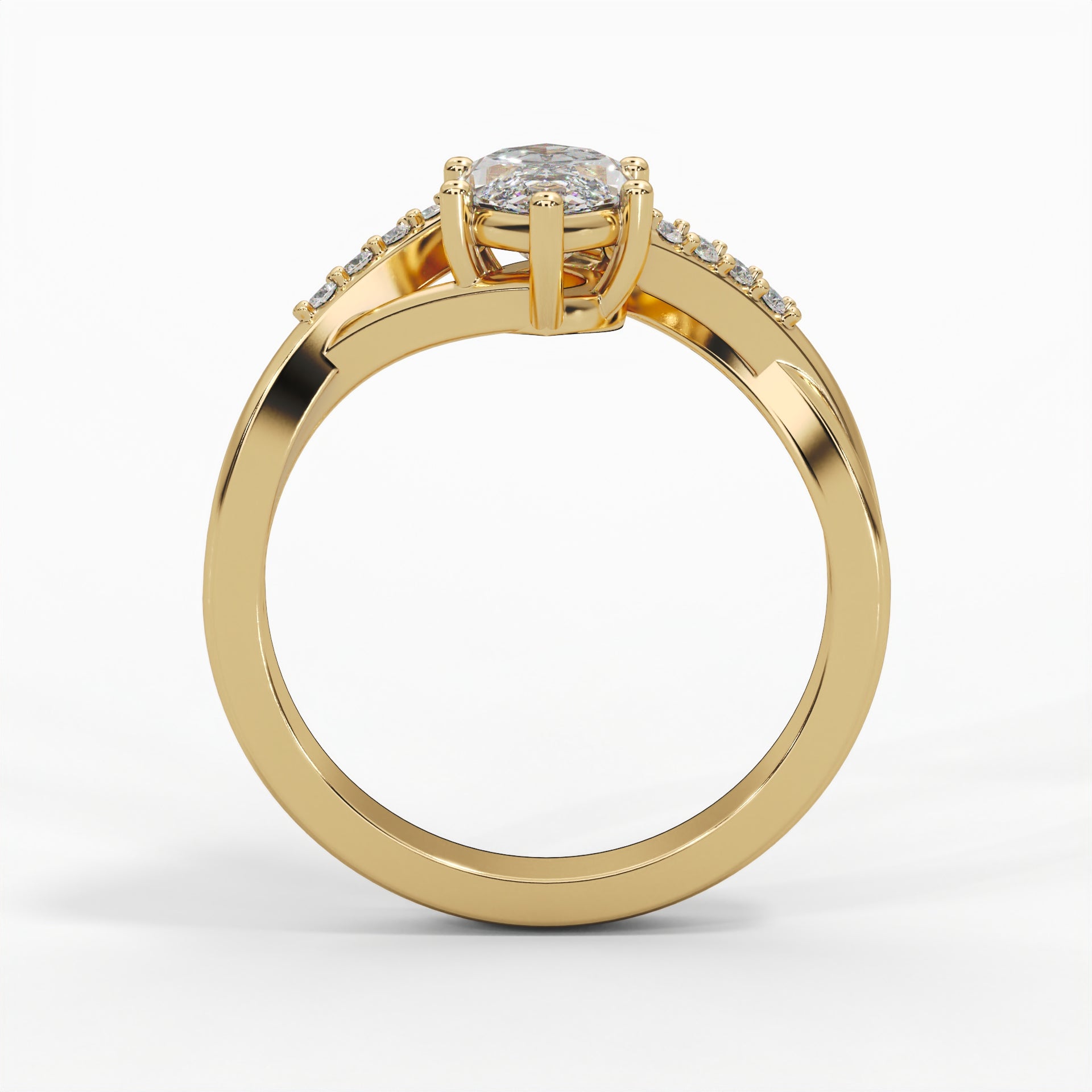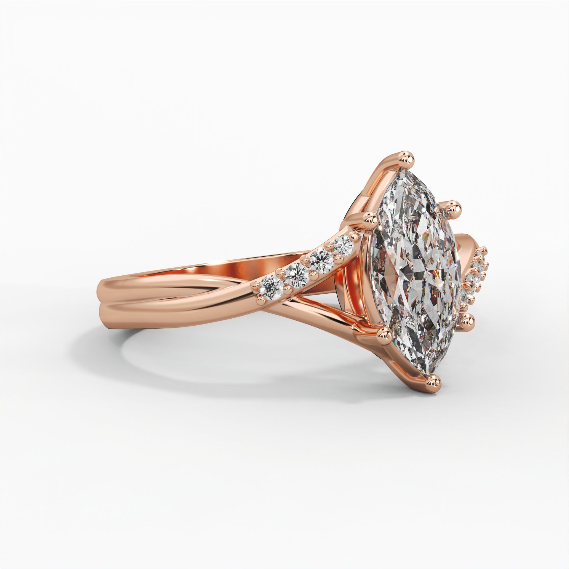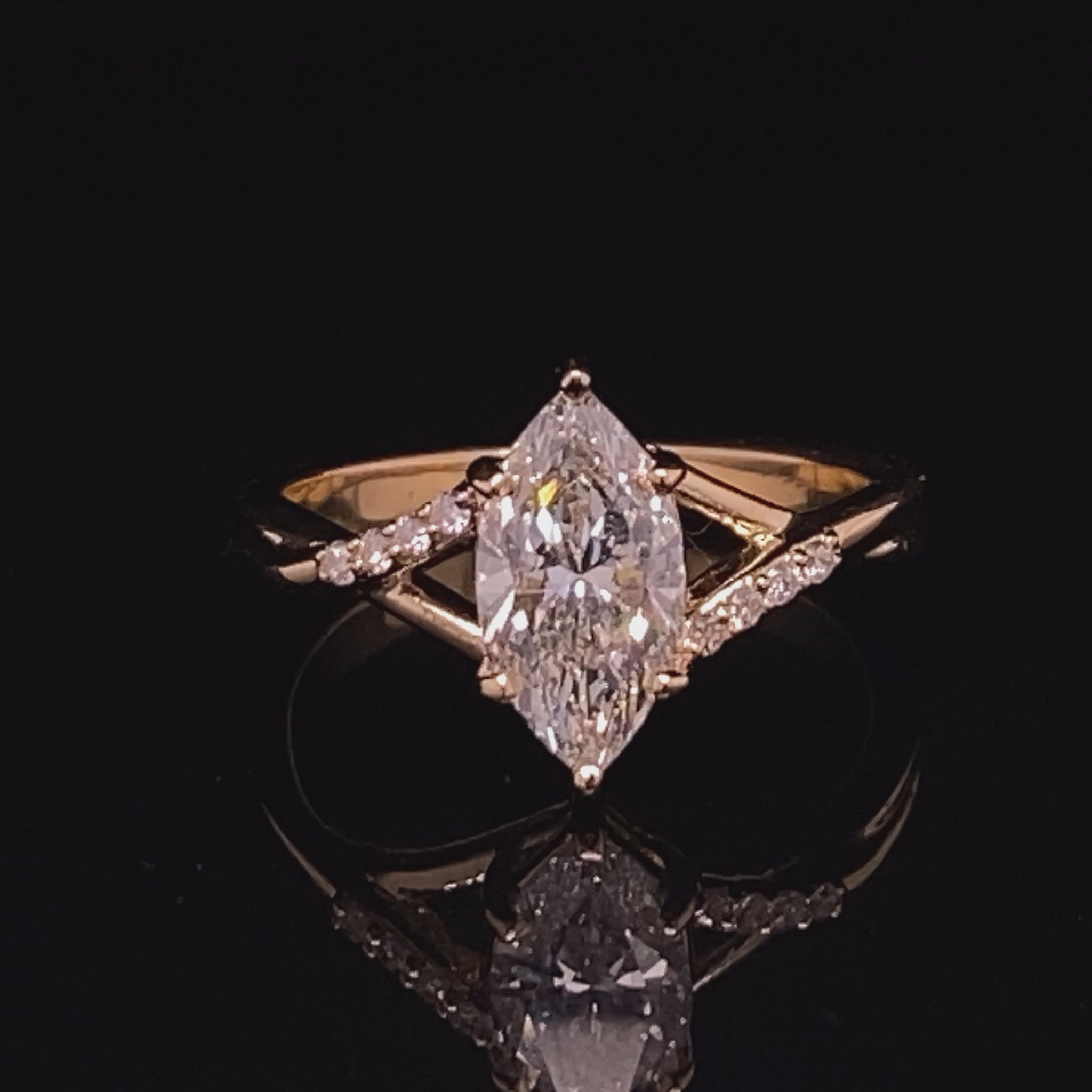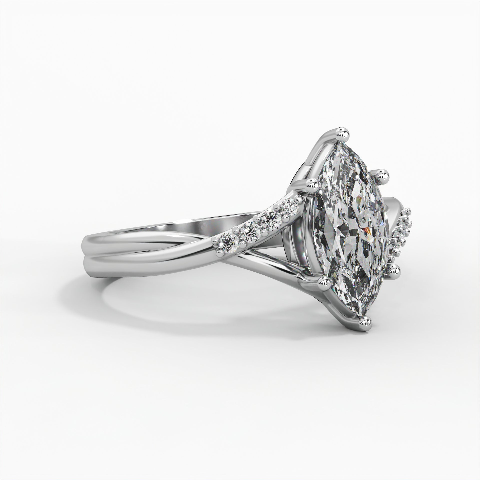 Solitaire, Marquise diamond on a twisted split shank setting. A 1.20 carat center marquise and .16 carats diamonds on the setting.